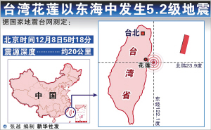 新华社北京12月8日电 据国家地震台网测定,北京时间12月8日5时18分,在台湾花莲以东海中(北纬23.9度,东经122.1度)发生5.2级地震,震源深度约20公里。