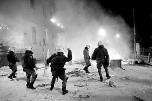 参加抗议的青年向警察投掷石块,警察施放催泪瓦斯弹还击。雅典市中心一片混乱,市中心的商铺几乎都遭到不同程度的毁坏。