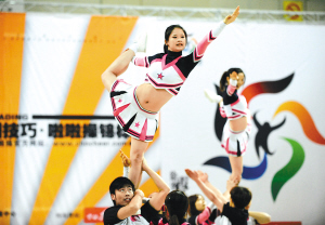 12月9日,2008全国技巧暨首届拉拉操锦标赛在江苏省江阴市开赛。图为武汉大学代表队在比赛中表演。 新华社发
