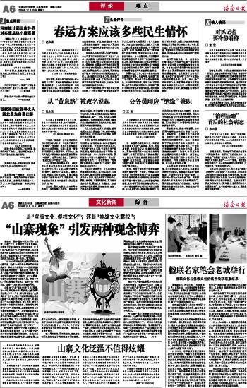 本报澄迈12月9日电 (记者蔡葩) 12月4日至8日,由海南永庆寺邀请的一批中国楹联、书画名家荟萃澄迈老城盈滨半岛,寻访苏东坡在此留下的遗迹,为海南名古寺永庆寺量身定做了20多幅楹联,并且用隶书、大篆、楷书、行草等书体现场挥毫,留下一批丰厚的精神产品。 海南省军区副司令员刘峻嶂将军、中国书协第五届副主席吴东民、省作家协会主席孔见以及澄迈县委县政府主要领导等到场观摩了这次别开生面的楹联名家笔会。 应邀参加这次笔会的有中国楹联学会主席常江、副主席娄以忠、常务理事郑训佐、高宝庆;中国沫若书画院院长余新志;中国书画艺术委员会理事车应连;中国书协第五届副主席聂成文;中国文物学会书画艺术委员会理事、书画家刘运良;中国对联文化研究会秘书长刘太品等10人。今年66岁的常江教授更是当今联坛一大名家。近10年来,曾主持数十次全国征联评选工作,并长期担任中央电视台对联节目主讲人,被评为全国“联坛十杰”。 12月8日,常江教授在接受海南日报记者采访时说:“佛教文化有着独特的魅力,自宋代起就在海南扎下深根。宋代建立的永庆寺是海南历史上有名的禅林圣地,北宋大文豪苏东坡曾数度前往礼佛参学,使之名扬四方,法音传播各地。从历史上来讲,楹联与寺院有着千丝万缕的关系。有的寺院是因为著名的楹联而名满天下的,古刹被毁而楹联永存的例子在中国并不少见。楹联言简意深,对仗工整,平仄协调,它始于五代,盛于明清,迄今已有一千多年的历史。海南永庆寺选择这一文艺形式、集中全国楹联专家创作同一佛教主题,表达佛教文化的精深博大,弘扬佛法,就我所知在全国来讲应该是第一次。” 永庆寺坐落于风光秀丽的澄迈县盈滨半岛,为古代“澄迈八景”之一。曾几度毁于战火,近年得以重建。现已建好的永庆寺占地80多亩,仿宋“伽蓝七殿”风格,布局和谐,庄严瑰丽。寺内主要建有大雄宝殿,在大雄宝殿四周建有歇山式天王殿、观音殿、文殊殿、普贤殿、地藏殿等,各殿主尊佛像重约17~19吨。全堂42尊玉佛均采用整块缅甸白玉精雕细琢而成,乃世所罕见。 从12月4日到8日,楹联家们现场感受永庆寺佛教文化厚重的历史,获得创作灵感,创作出独此一份的楹联,颇具匠心。在楹联成果展出现场,来自各界的楹联、书法爱好者兴趣盎然地欣赏着书写风格各异、内容和谐统一的楹联,久久不肯移步。娄以忠撰书的“永日任流连,迈步金沙登净土;庆云朵烂漫,澄怀玉磬悟禅心”,把永庆寺和澄江、迈岭、金沙净土都包含了,令人称奇;常江撰书的“万水同归地,一尘不染天”和刘运良的“海天一色空禅境,钟鼓三声弘法音”禅意高远,与自然环境十分贴合;刘太品撰写的“古刹溯千年,圣境重开依碧海;佛光辉九域,灵威一现远红尘”则将历史和现实链接一起,令人遐想。 对此次活动的成果,清华大学研究员范哲女士在接受记者采访时说,在传统诗歌、楹联面临断代的今日,举行这样的文化交流活动意义很不一般。可喜的是,这次被邀的楹联专家中至少有三位是50岁左右的。在佛教文化得到弘扬的今日,楹联与佛教文化的结合将获得双赢的结果。 |