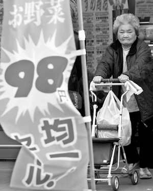 在这张12月5日拍摄的照片上,一名日本妇女推着购物车走出川崎市一家挂着“蔬菜打折仅售98日元”广告的杂货铺。98日元,约合1.05美元。日本是世界上消费水平最高的国家之一,但受全球金融危机影响,这里的家庭主妇也开始过起勤俭生活。 新华社/路透