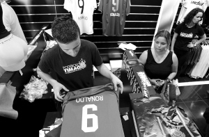 | 12月10日,在巴西圣保罗,球迷(左二)在购买印有罗纳尔多名字的科林蒂安斯队队服。 新华社发 |