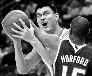 | 姚明(左)进攻被老鹰队霍福德干扰。