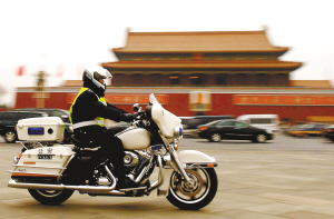 12月10日,一名交警驾驶警用哈雷摩托车在天安门广场巡逻。由企业捐赠的3辆警用哈雷摩托车日前在北京东城交警支队帅府园队正式上岗。 新华社发