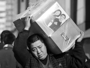 | 12月11日,一名男子在北京新天意商品批发市场搬运商品。