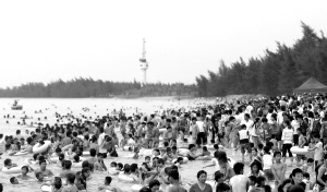 | 端午节,盈滨半岛海边聚集大量洗龙水的市民。 本报记者 李英挺 摄 |