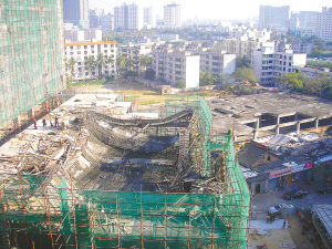 施工队安全人员叶先生介绍,发生坍塌的是裙楼四楼顶的花架顶,是作为绿化装饰用的。当天上午工地开始浇筑这个高7.2米,跨度16米的花架顶。下午快3点的时候,整个花架顶就要浇筑完了,这时工人们发现钢铁支撑架变形了,于是迅速发出撤离现场的信号。一名工人受到惊吓较严重,另2名工人在逃离现场时手脚被支撑架划伤。这3名工人都已送到市医院检查。