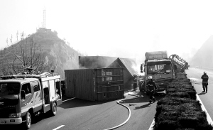 12月12日上午11时许,浙江省甬(宁波)金(金华)高速公路绍兴段发生一起严重交通事故,两辆集装箱半挂车、两辆轿车和一辆危险化学品运输车发生追尾,造成6人死亡。 新华社发(张亮宗 摄)