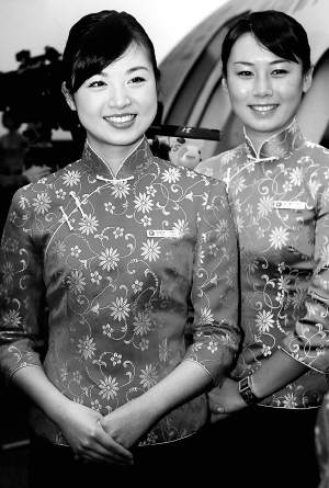 上海东方航空公司乘务人员展示唐装。经“截弯取直”新航路前往台湾的第一班两岸平日包机即将于12月15日由东航一架空客321飞机执飞,从上海浦东机场起飞前往台北桃园机场,从而拉开大陆前往台湾的两岸平日包机序幕。 新华社发