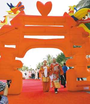| ← 12月12日,一对老外新人身着唐装迈过三亚国际婚庆节红双喜大门。
