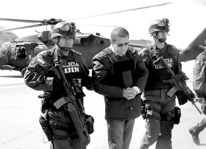 12月12日,在哥伦比亚首都波哥大,哥伦比亚司法警察押送大毒枭迭戈·蒙托亚(左二)走向美国缉毒署的直升机,准备将其引渡到美国。哥伦比亚总统乌里韦11日签署行政决议,同意将美国联邦调查局“十大通缉要犯”之一、哥伦比亚大毒枭迭戈·蒙托亚引渡到美国接受审判。新华社/路透