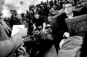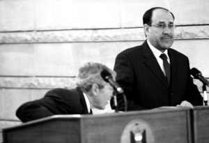 12月14日,在伊拉克首都巴格达举行的记者会上,美国总统布什(左)弯腰躲避袭击。当日,伊拉克记者扎伊迪在布什与伊拉克总理努里·马利基(右)召开的联合新闻发布会上脱下自己的鞋,扔向布什。左图为扎伊迪(中)被按倒在地。 新华社/路透