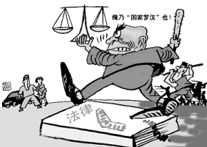 江西抚州市临川区法院一名职工在上班期间参与一起斗殴,在殴打对方时大声叫嚣道:我是法院的,我代表国家罗汉,花100万弄死你这个农民。有网友在博客里留言:“罗汉”一词在江西的意思是地痞流氓,黑社会老大。是一种方言,“国家罗汉”,可以解释是国家发工资的地痞流氓。