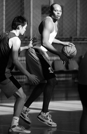 | ↑12月15日,邦齐·威尔斯(右)在山西中宇训练基地首次参加队内训练。邦齐·威尔斯已顺利通过体检,目前离正式加盟山西中宇只剩下“两步之遥”:等待国际篮联确认威尔斯是自由球员的澄清信,再由篮管中心加以确认。