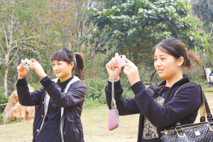 | 来自湖南的刘女士(右)和叶女士,在看到海南日报14日头版的《冬日五指山“枫景”无限好》的报道后,特地从三亚赶到五指山观赏美景。图为她们正在用相机狂拍枫叶。