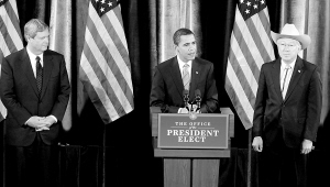 12月17日,美国当选总统奥巴马(中)在芝加哥举行的的新闻发布会上宣布提名前艾奥瓦州州长维尔萨克(左)为农业部长人选,并提名科罗拉多州联邦参议员萨拉萨尔(右)为内政部长人选。 新华社/法新