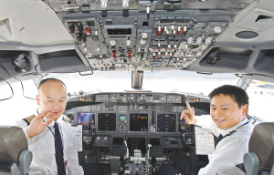 | 12月20日,海口直航台北松山的HU7947航班安全抵达后,两位机组人员打出成功的手势。 本报特派记者 李英挺 摄 |