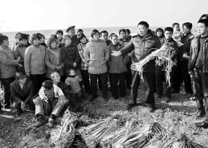 12月17日,在河南省嵩县闫庄镇店上村,一位农业技术员在向返乡农民工讲授优质大葱的技术标准。为了帮助返乡农民工提高就业能力,镇政府发挥当地在花生、大葱、烟叶等农作物方面的产业优势,对返乡农民工进行技术培训。截至12月17日,已分5批累计培训2800人次。 新华社记者 王颂 摄