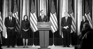 | 12月19日,美国当选总统奥巴马(中)宣布最后一批内阁成员提名。