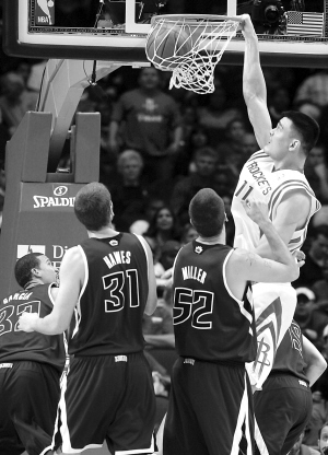 | 国王队多名球员挡不住姚明(右)扣篮。 新华社发 |