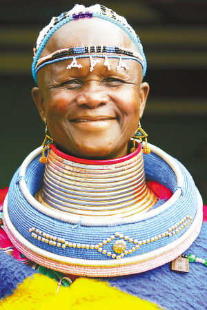 恩德貝勒村并不大,几十座圆形低矮草屋错落路旁林间,屋外绘有各种彩色图案。他们的庆祝仪式充满神秘色彩,20名男女老少,身披兽皮,或站或坐,或列队或围圈,或敲鼓或吹哨……一些老妇人脖子套着N多的银项圈,脖子也因此被挤得又长又细,脚上也同样是层层套圈,光头上带着各种彩色编织饰品———这是我曾在电视电影杂志里常看到的土著人。尽管他们的班图语与我们无法交流,但是人与人之间,笑容似乎总是相通的,通过笑容与手势,土著人与我们这些外来之客,彼此感受到了友善。