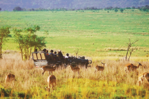 | 在恩塔贝尼野生动物保护区,游客坐着“野猪车”穿行在野生动物群中。
