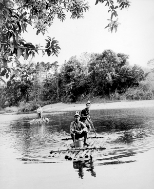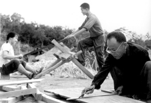 | 在割胶班班长王福生(右)的带领下,知青自己动手造木排,建宿舍。 |