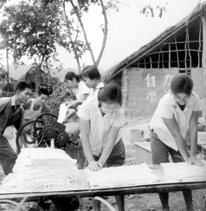 | 在简陋的条件下,割胶班知青们自己动手制胶,熏胶片。 |