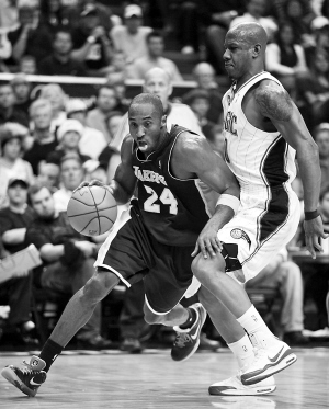 | ← 12月21日,湖人队不敌魔术队,遭遇两连败。图为科比(左)带球突破,魔术队球员紧追不舍。 新华社发 |