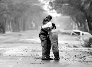 9月13日,在遭受了飓风艾克袭击的美国德克萨斯州的加尔维斯顿,一名搜救人员拥抱一名受灾居民。