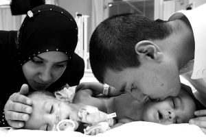 10月22日,在沙特阿拉伯首都利雅得的一家医院,伊拉克连体男婴齐亚德和伊亚德的父母亲亲吻熟睡中的孩子。