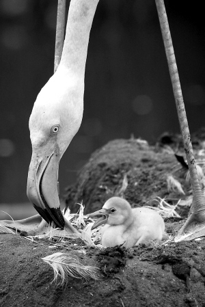 四月三十日,在美国圣迭戈动物园,一只雄性火烈鸟照看自己刚刚出世的孩子。