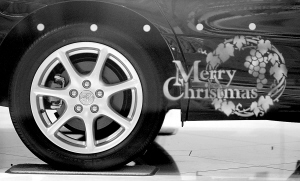 22日,日本横滨一处丰田汽车公司展厅的橱窗贴上了“圣诞快乐”的祝福语。当天,丰田汽车公司总裁渡边捷昭(右图)宣布,丰田公司2008财年将出现1500亿日元的营业亏损。 新华社/路透