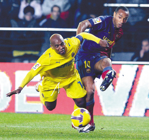 12月22日,在西甲第16轮比赛中,巴塞罗那队客场以2比1战胜比利亚雷亚尔队。图为亨利(右)与比利亚雷亚尔队塞纳拼抢。 新华社发