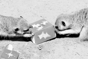 12月23日,在澳大利亚悉尼的塔朗加动物园,两只猫鼬努力扯开圣诞礼物的包装。圣诞节将至,塔朗加动物园的工作人员为动物们送上了一份份圣诞礼物。 新华社/法新