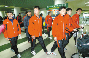 | 十二月二十三日晚,朝鲜国家男子足球队步出海口美兰机场。他们将在海南嘉得足球训练基地进行为期一个月的冬训。 本报记者 苏晓杰 摄 |