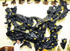 12月23日,在云南省德宏傣族景颇族自治州潞西市的勐巴娜西珍奇园内,一名工作人员正在介绍酷似中国地图的万年阴沉木。 在云南省德宏傣族景颇族自治州潞西市的勐巴娜西珍奇园内,有一块天然形成的万年阴沉木。这块重达1吨的巨木形状酷似中国地图,让人叹为观止。阴沉木又叫乌木,是埋藏于地下成千上万年的古树在地壳运动或山崩洪水等自然力作用下,形成的似石非石、似木非木的独特木料。 新华社发