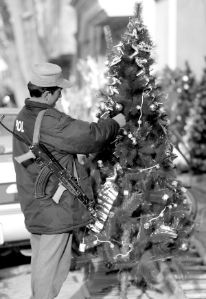 12月24日,在阿富汗首都喀布尔的花卉市场,一名警察正在摆弄待售的圣诞树。在喀布尔,庆祝圣诞节的主要是国际组织和国际安全部队人员。 新华社发(扎比摄)