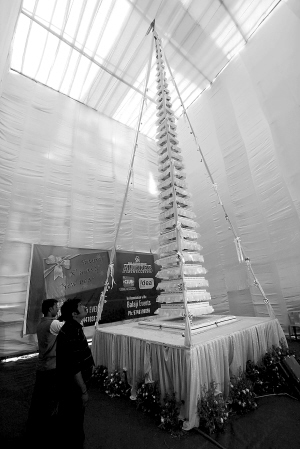 12月24日,人们在印度南部城市戈奇参观一个约10米高的33层蛋糕。印度皮特蛋糕房的45名厨师用了15天时间才制作完成这个约10米高、重600公斤的蛋糕。 新华社/路透