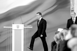 | 这是2008年5月7日梅德韦杰夫(左)和普京(右)在俄罗斯首都莫斯科参加总统宣誓就职仪式。梅德韦杰夫在今年3月举行的总统选举中当选俄新一届总统,并提名卸任总统普京出任新一届政府总理。 新华社发 |