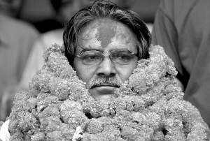 2008年4月12日,在尼泊尔首都加德满都,尼泊尔共产党(毛主义)主席普拉昌达得知赢得制宪会议选举后佩戴花环庆祝。5月28日,尼泊尔制宪会议第一次会议通过议案,宣布尼泊尔为联邦民主共和国。7月,尼制宪会议选举出尼泊尔首任总统;8月,普拉昌达作为共和国首任总理,领导组建了第一届执政联盟新政府。 新华社发 |