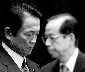 | 2008年9月3日,日本自民党干事长麻生太郎(左)和即将离职的日本首相福田康夫在东京自民党总部参加会议。福田康夫2007年9月就任日本首相,但由于内阁支持率长期低迷,于2008年9月1日宣布辞职。2008年9月24日,麻生太郎当选为日本新一任首相。 新华社发