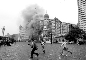 | 11月29日,在印度孟买,几名摄影记者从燃烧着的泰姬玛哈酒店前跑过。11月26日至29日,印度孟买遭遇连环恐怖袭击。15名恐怖分子乘快艇从海上登陆,在孟买市内10个地点展开袭击。恐怖分子占领泰姬玛哈和奥贝罗伊酒店后造成大量人员伤亡,两家酒店的建筑也遭到不同程度破坏。 新华社发 |