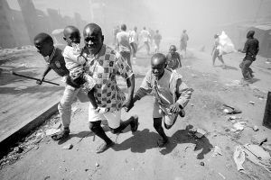 | 1月1日,在肯尼亚首都内罗毕迈特海尔贫民窟,一名男子拉着几名儿童逃离骚乱现场。肯尼亚选举委员会2007年12月30日宣布齐贝吉赢得总统大选,但反对党指责齐贝吉舞弊,拒绝接受选举结果,随后肯尼亚爆发了大规模骚乱,造成数百人死亡,25万人流离失所。 新华社发 |