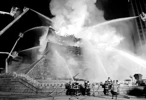 | 2月11日,在韩国首都首尔,消防人员奋力扑灭崇礼门上的大火。2月10日晚,一名男子利用崇礼门夜间无人看管的漏洞潜入纵火,导致这座韩国象征性建筑被完全烧毁。崇礼门(亦称南大门)建于1395年,是首尔历史最悠久的建筑,1962年被韩国政府定为一号国宝。