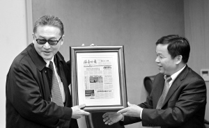 | 海南赴台新闻交流团团长、海南日报报业集团总编辑钟业昌向李敖赠送海南日报报样。 |