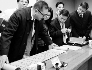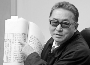 | 李敖向海南赴台新闻交流团成员展示自己珍藏的苏东坡手迹《春帖子训》。 |