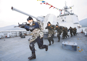 护航舰队增派的特战人员最引人关注。记者注意到,他们一律平头,穿着深蓝色的特战服,胸口处清清楚楚地标着“中国特种部队”标志,个个精神抖擞,威风飒爽。