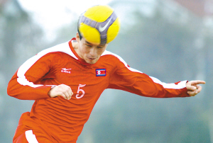 | 至12月26日,朝鲜国家男子足球队在桂林洋海南嘉得足球训练基地,已进行了两天的训练。据领队金正值介绍,嘉得基地为球员们提供了周到热情的服务,他们非常满意。朝鲜队预计明年1月20日结束在海南的冬训返回平壤。图为一名球员在练习头球。 本报记者苏晓杰摄 |