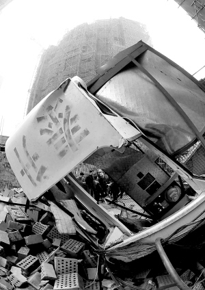 12月27日,工作人员正在勘查坠落的升降机挂篮。 新华社记者 李尕 摄
